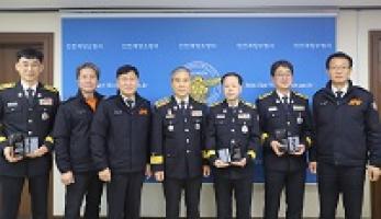 Incheon Gyeyang Fire Station announced on the 6th that it presented plaques of merit to three firefighters with over 30 years of service in the chief's office.